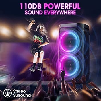 Powerful 100W Party Bluetooth Speaker with Deep Bass and Huge 110dB Sound Quality: The W-King T11 Portable Bluetooth Speaker is an amazing 100W Party Speaker with Huge 110dB Sound, Two 1.25" Tweeters and 2 Passive The radiator, coupled with advanced DSP technology, gives your music striking bass and clear highs, get ready to enjoy the dreaded rumble that dances your body. (Note: We have firmware to update the bass, if you need more bass, please contact the W-KING support team.)